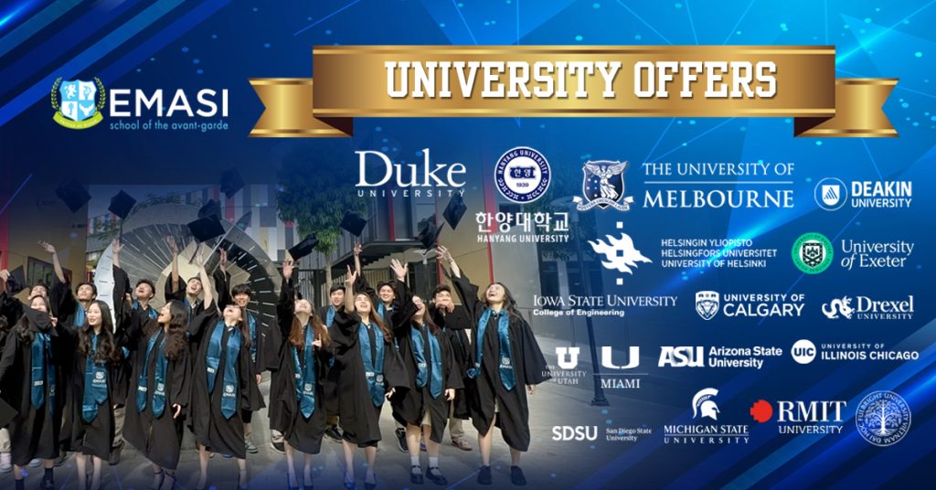 The University of Melbourne, Duke University, University of Wollongong, Deakin University, Fulbright University Vietnam, RMIT University,… là một vài trong số hàng loạt trường đại học danh tiếng mà học sinh lớp 12 EMASI đã xuất sắc chinh phục. Nhiều em đã giành được những suất học bổng danh giá với tổng trị giá lên đến hàng triệu USD.