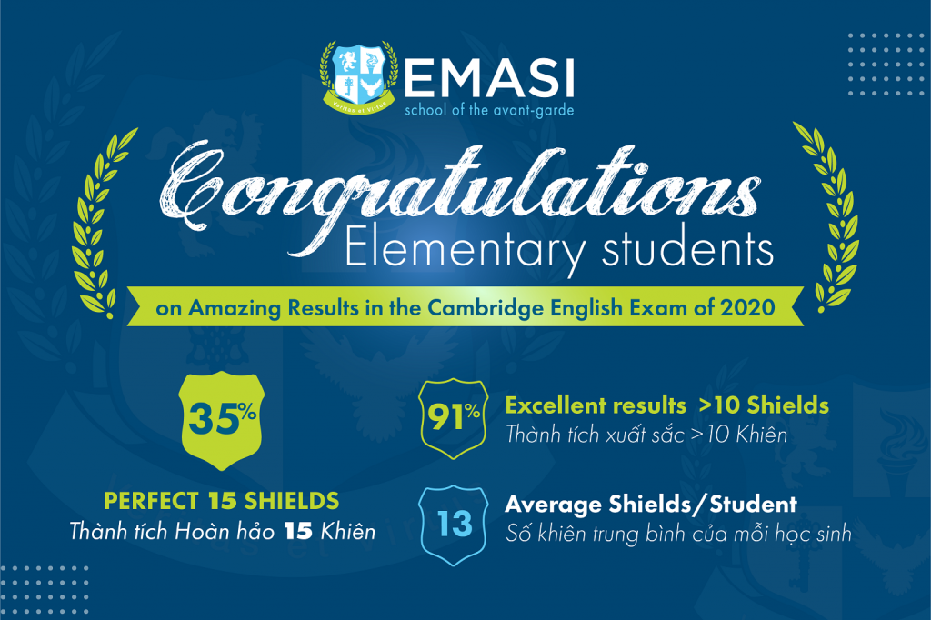 Những nỗ lực của thầy và trò trường EMASI đã được ghi nhận bằng những thành tích xuất sắc đạt được trong kỳ thi Tiếng Anh Cambridge được tổ chức vào cuối năm học 2019-2020. Kết quả tuyệt vời của các em học sinh được thể hiện qua số khiên trung bình 13, trên 90% học sinh đạt thành tích vượt trội (trên 10 Khiên), trong đó 35% đạt điểm tuyệt đối. Đây là một kết quả đáng mừng sau những cố gắng của cộng đồng trường ngay trong năm học đầu tiên và trước những khó khăn do dịch Covid-19 đem lại.